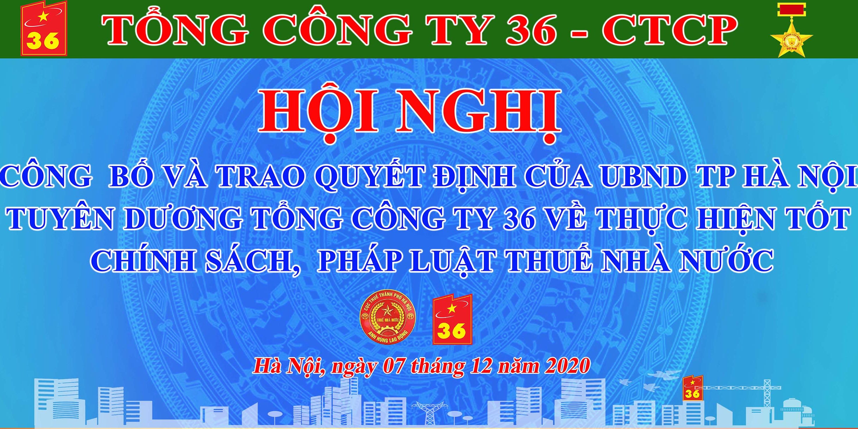 Thực hiện Quyết định số : 3336/QĐ-UBND ngày 29/7/2020 của UBND Thành Phố Hà Nội về việc tuyên dương người thực hiện tốt chính sách, phát luật thuế năm 2019 trên địa bàn thành phố Hà Nội. Vào hồi 13h30′ ngày 7/12/2020 tại trụ sở Tổng công ty 36 – CTCP, Cục thuế Hà Nội phối hợp với Tổng Công ty 36 – CTCP đã tổ chức Hội nghị: Công bố và trao quyết định của UBND Thành phố Hà Nội tuyên dương Tổng Công ty 36 thực hiện tốt chính sách, pháp luật thuế Nhà nước, Tham dự Hội nghị có đồng chí Cao Văn Thắng – Trưởng phòng Kiểm tra Thanh tra 6 – Cục Thuế Thành phố Hà Nội và Bà Phạm Hồng Hạnh, chuyên viên phòng Kiểm tra thanh tra 6 – Cục thuế Hà Nội. Về phía Tổng công ty 36, dự Hội nghị có đồng chí AHLĐ, đại tá Nguyễn Đăng Giáp, cùng lãnh đạo chỉ huy, cán bộ chủ chốt của Tổng Công ty 36.